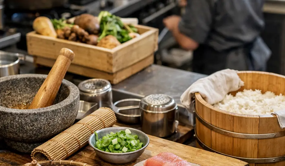 Some dishes are their ingredients. Hand-cut soba made with buckwheat flour can't be approximated with spaghetti. A dashi-forward clear soup (suimono) built on kombu and katsuobushi loses its identity with mushroom stock. Sashimi is raw fish — there's nothing to substitute.